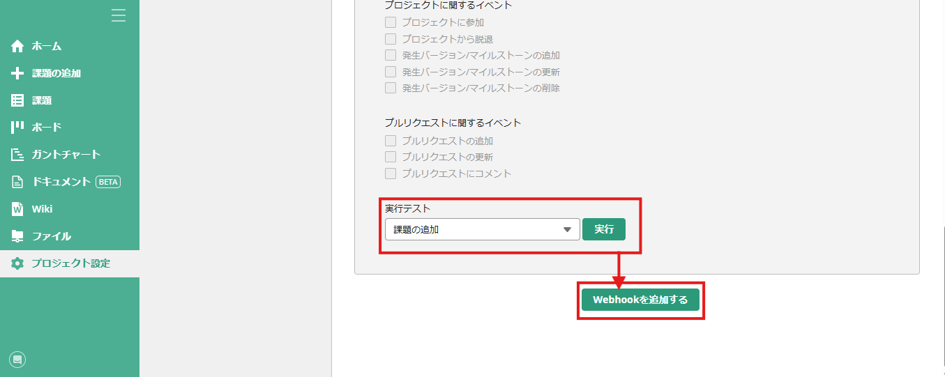 下までスクロールし、実行テストは「課題の追加」を選択したら「実行」ボタンをクリックし、Webhookを追加をクリックしましょう。