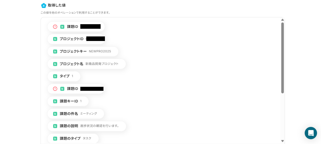 Backlogに登録した課題の情報が取得した値(アウトプット)に反映されるので、確認後設定を保存しましょう。