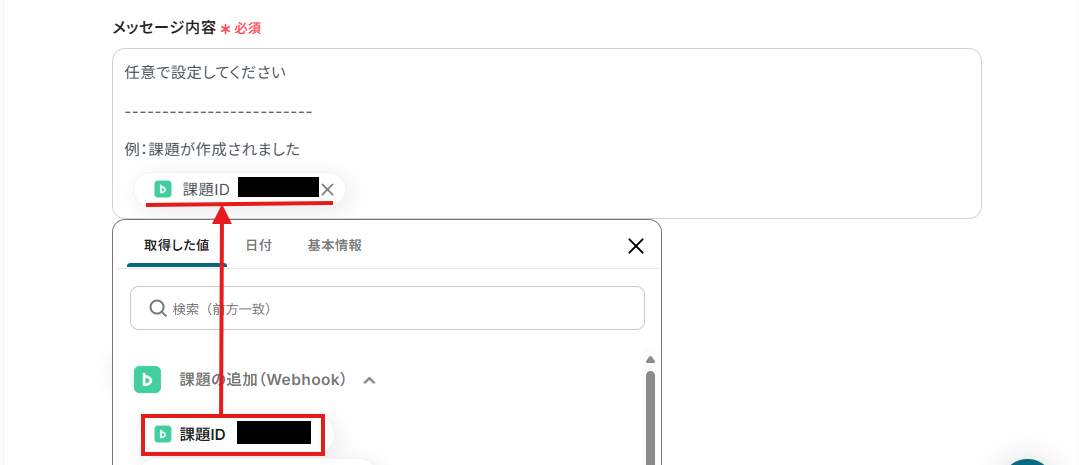例えば、下記画面のように設定するとBacklogに新規課題が追加されたら「課題ID」を自動で取得しGoogle Chatに通知することが可能です!
