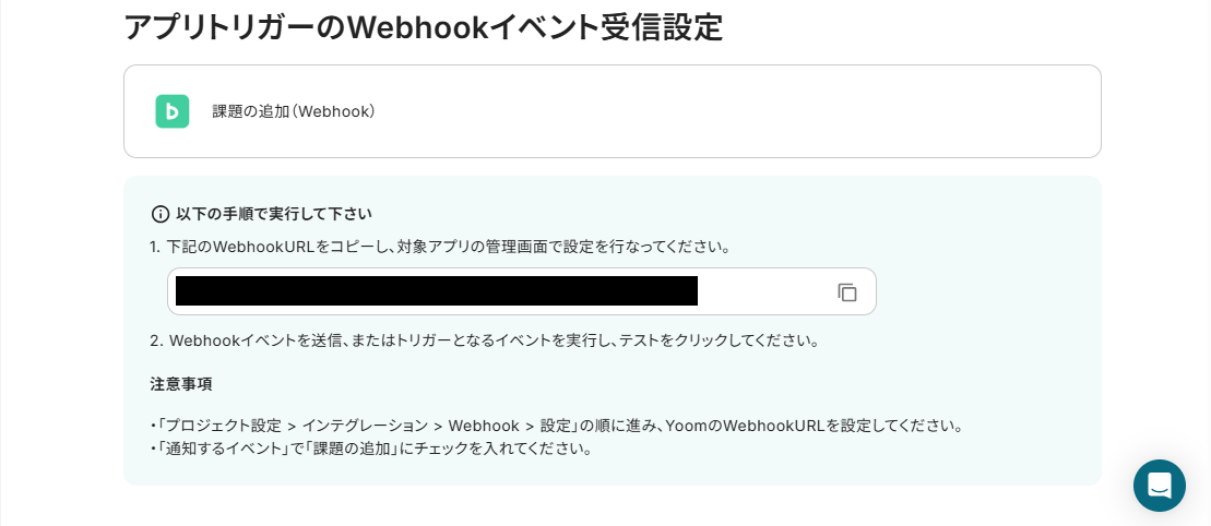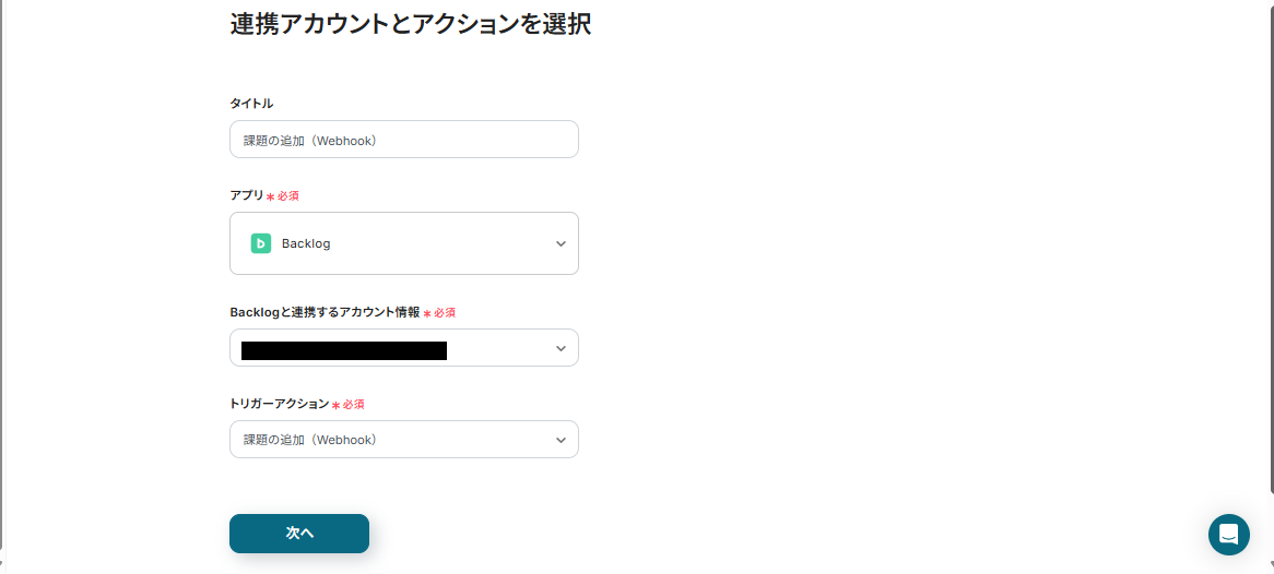 トリガーアクションは必ず「課題の追加(Webhook)」を選択し、そのまま次のページに進みましょう。