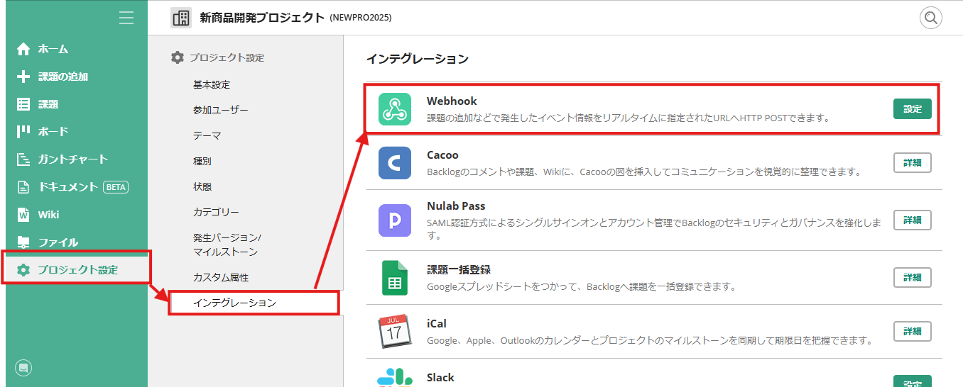 コメントを通知したいプロジェクトを選択し、「プロジェクト設定」→「院テグレーション」→「Webhook」の順にクリックします。