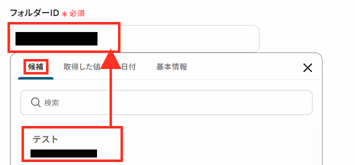 次に設定する「フォルダーID」は、ボックスをクリックして表示されるWrike内の候補から選択してください。