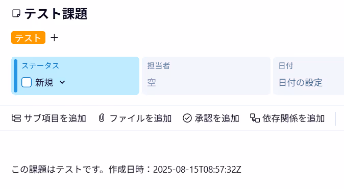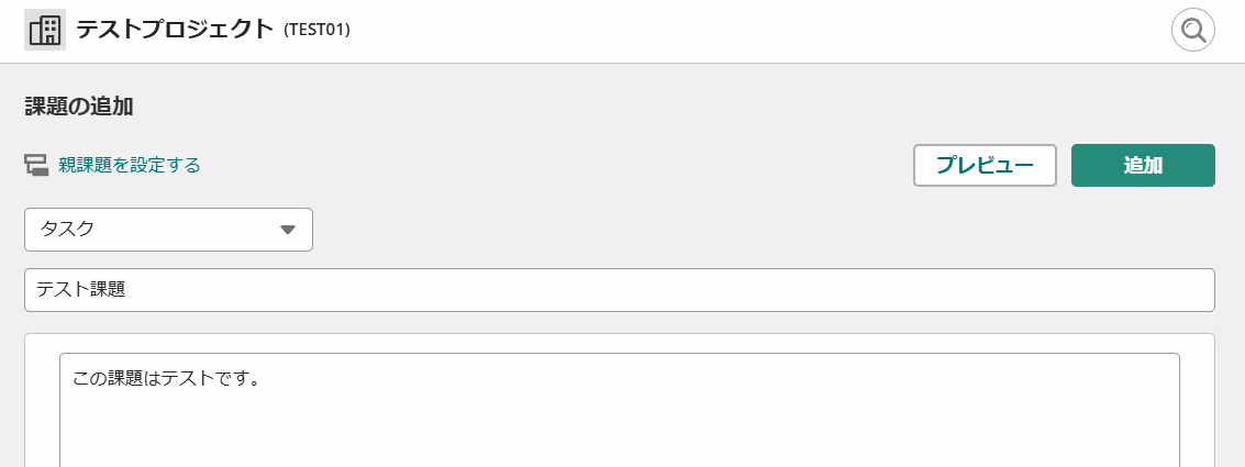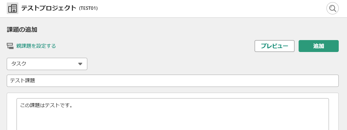 ここで一度Yoomを離れて、アプリトリガーを動かす条件となる「新しい課題」をBacklogの該当プロジェクトにテスト用として追加しておきます。