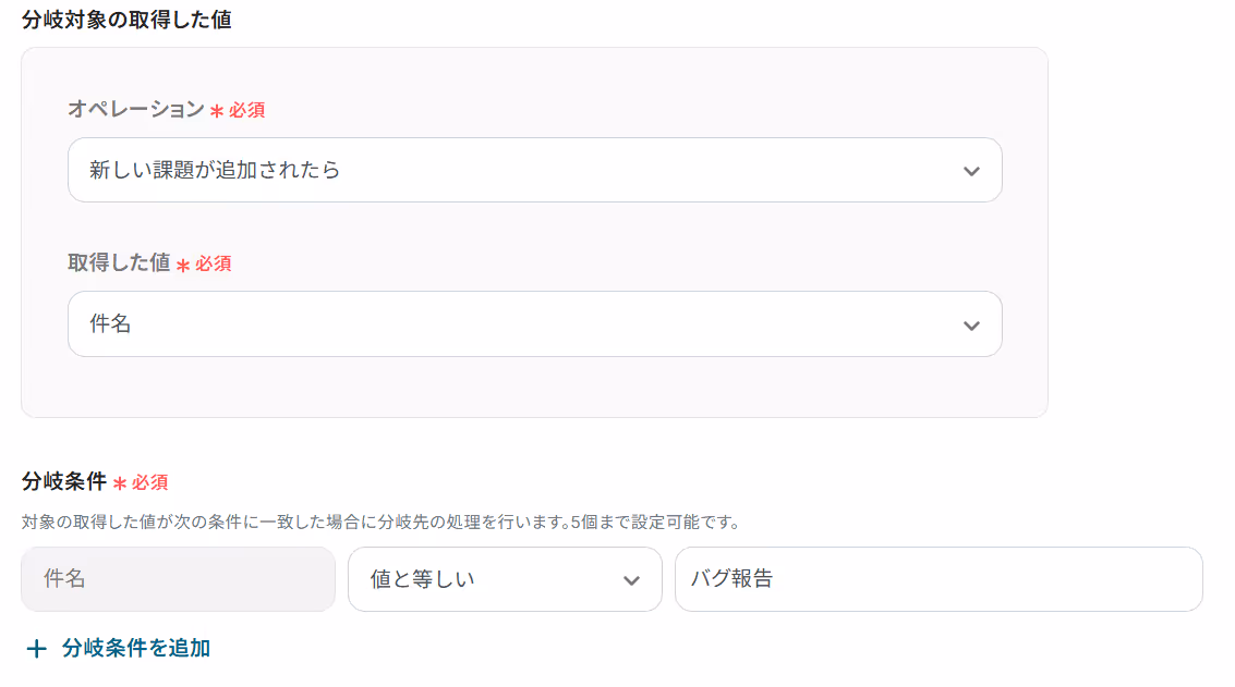 フローボットに「分岐オペレーション」を追加して条件を設定することで、「特定の課題(バグ報告など)」や「担当者がAさん」など、絞り込むことができます。