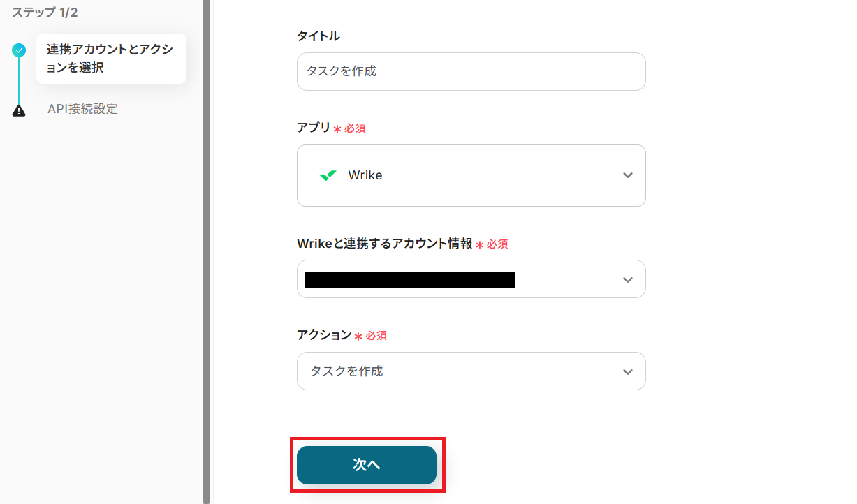 タイトルを任意で設定し、Wrikeと連携するアカウントやアクション内容を確認したら「次へ」を押してください。