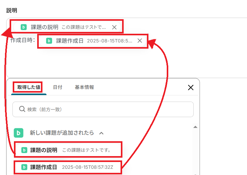 例えば「説明」の項目は、取得した値を活用して以下のように設定できます。