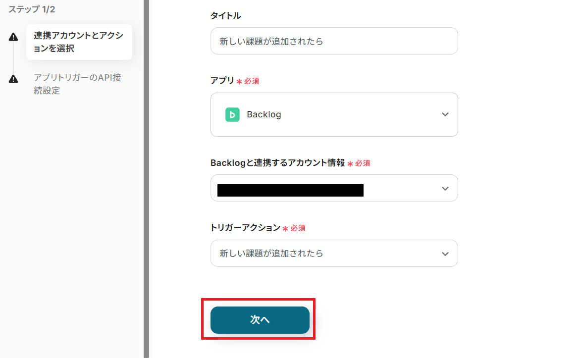 タイトルを任意で設定し、Backlogと連携するアカウントやアクション内容を確認したら「次へ」を押してください。