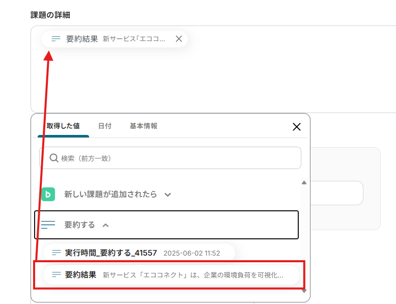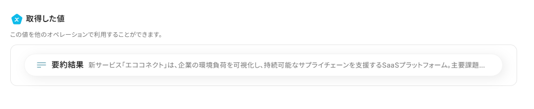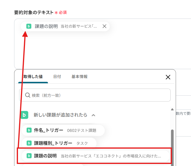「要約対象のテキスト」は、入力欄をクリックして表示されるアウトプット(取得した値)から選択してください。