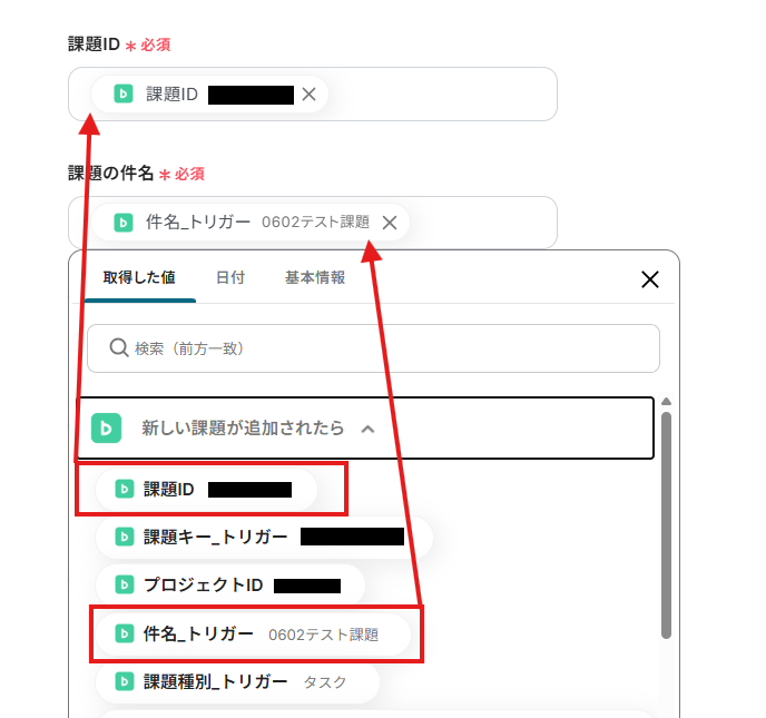 「課題ID」「課題の件名」は、入力欄をクリックして表示されるアウトプットから選択してください。
