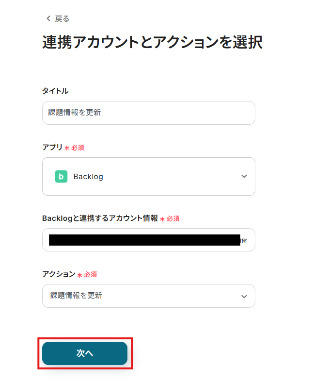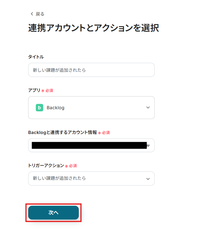 連携するアカウント情報には、ステップ1で連携したアカウント情報が反映されています。トリガーアクションはそのままにして、「次へ」をクリックしてください。