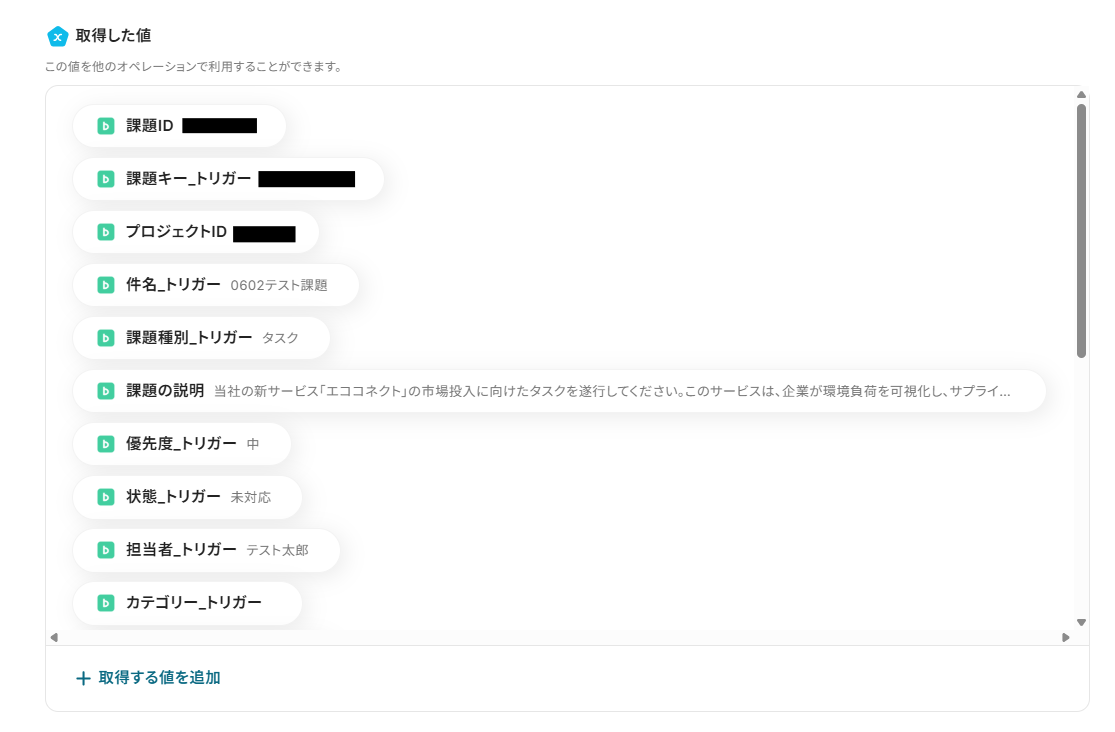 アウトプットとは、トリガーやオペレーション設定時に、「テスト」を実行して取得した値のことを指します。