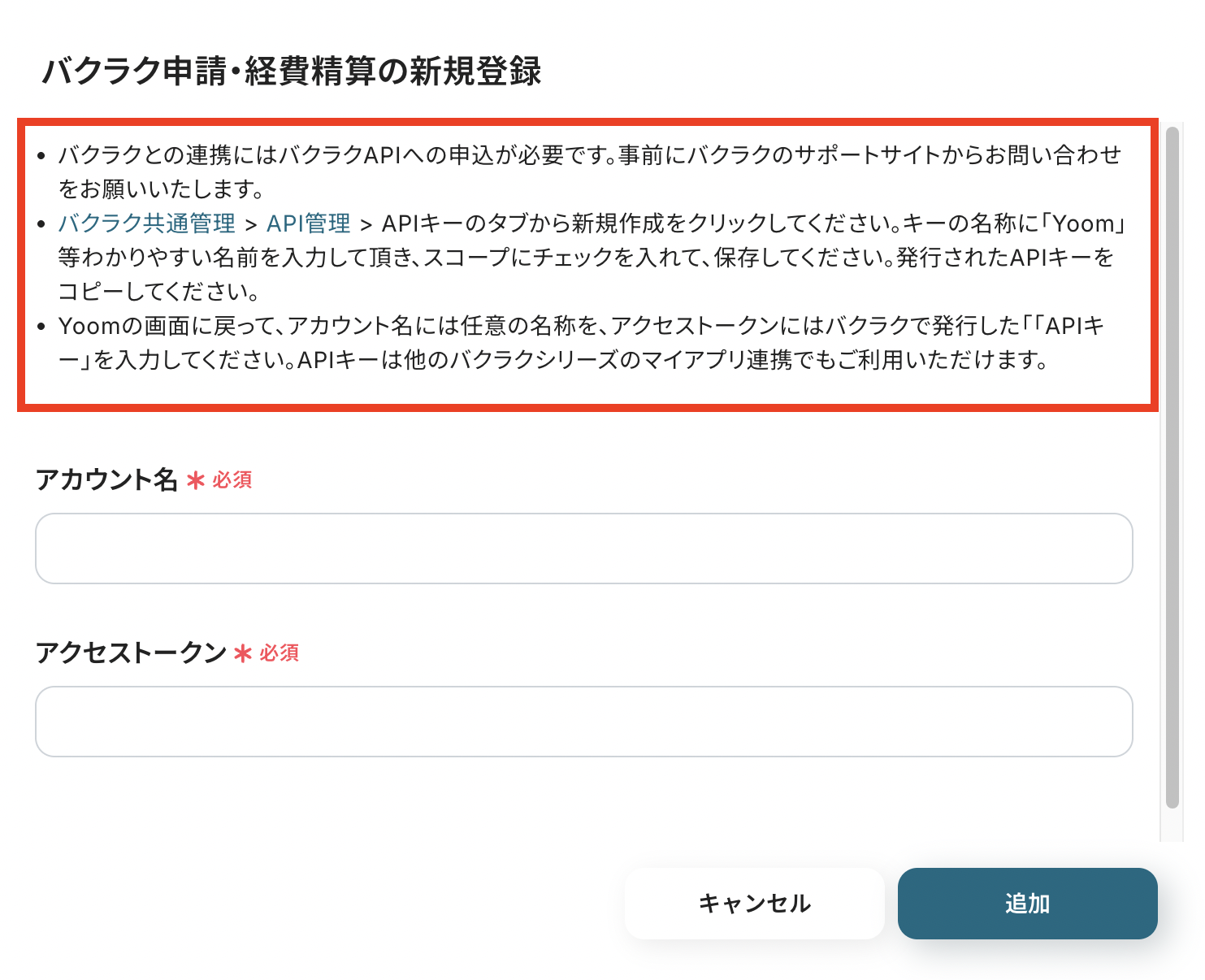 その上で「アカウント名」と「アクセストークン」を入力して「追加」をクリックしたら連携完了です!