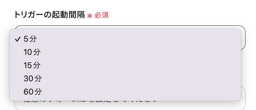 「トリガーの起動間隔」を5分・10分・15分・30分・60分から選択します。