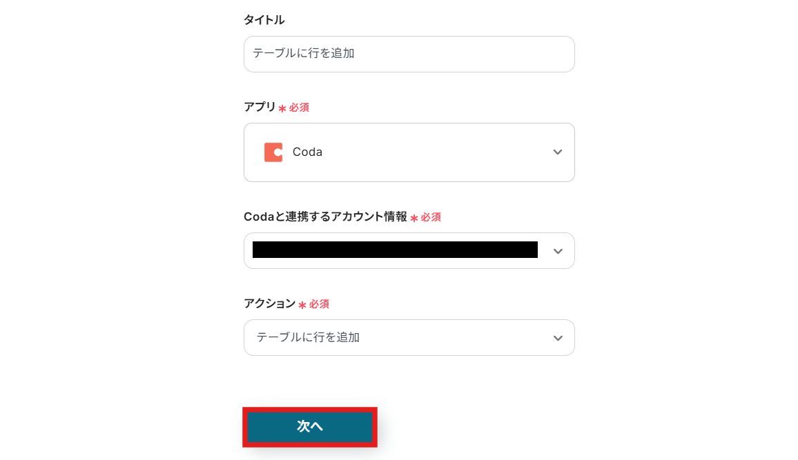Codaと連携するアカウント情報はプルダウンから選択します。