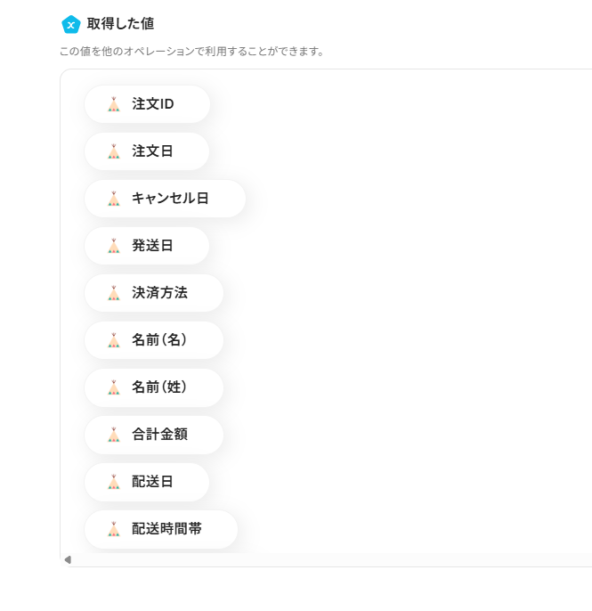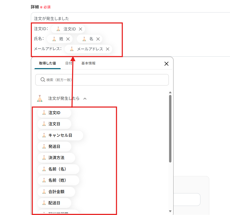 「注文ID」は、入力欄をクリックして表示される取得した値=アウトプットから選択してください。