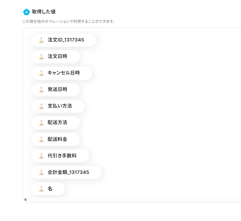 捕捉として、以下の取得した値=アウトプットには実際の注文データが挿入されていない状態です。実際には注文データが挿入された状態となります。