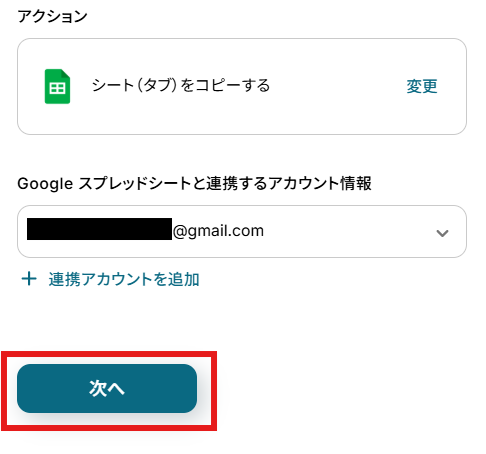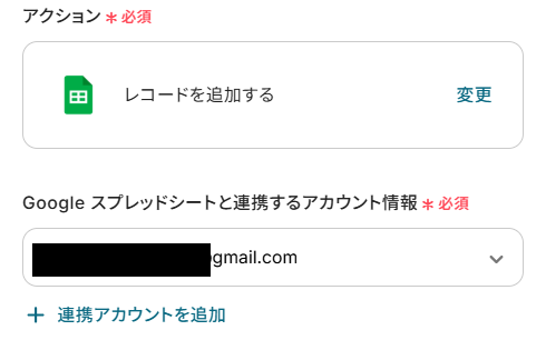 アクションはデフォルト設定のまま、アカウント情報は、連携したいアカウントが選択されているか確認してください。