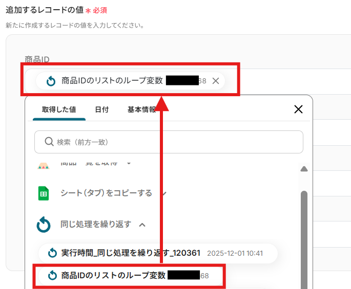 - 繰り返し処理機能では、前段のBASEで取得した商品一覧のデータを変数として指定し、繰り返し処理の条件を設定してください。