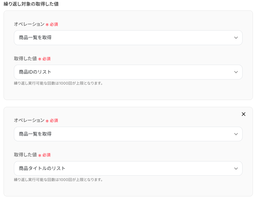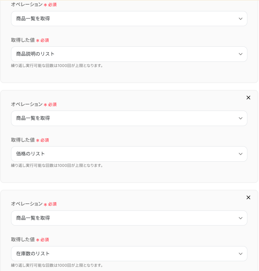 - 「同じ処理を繰り返す」オペレーションの処理数は最大1000回のため、商品数が多い場合はフローを分ける必要があります。