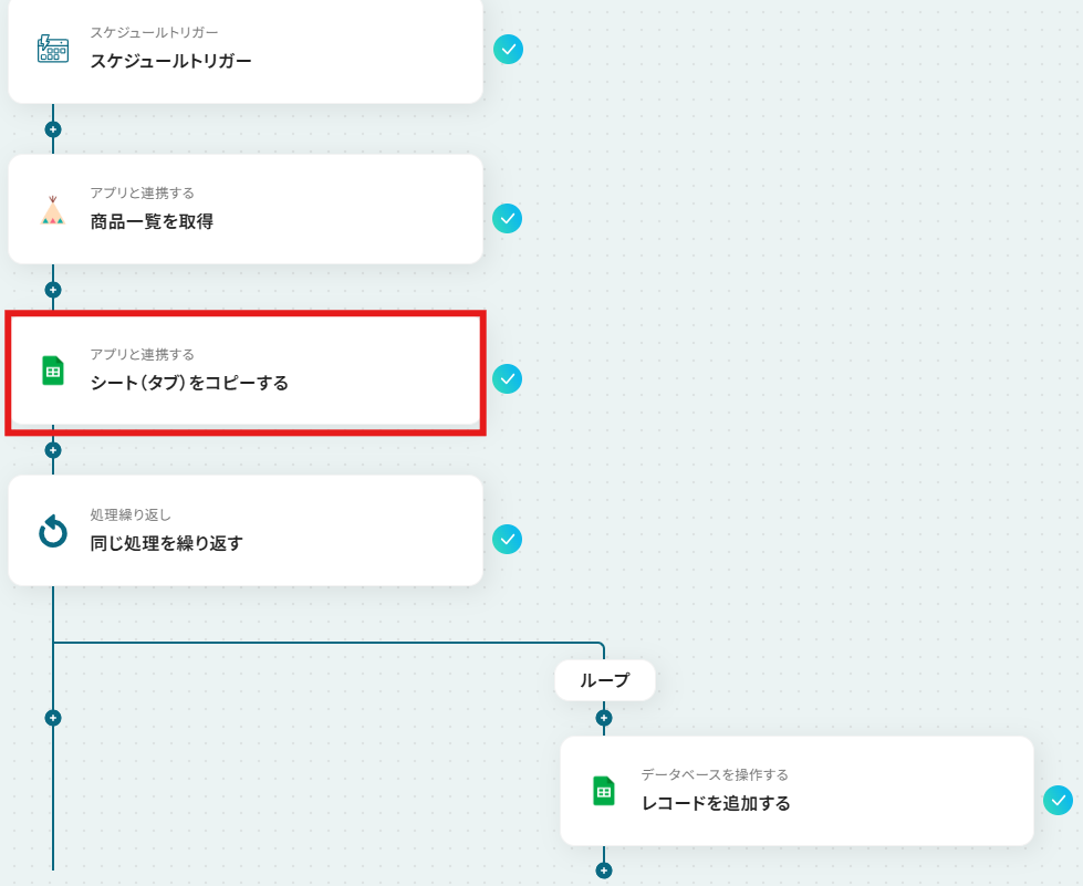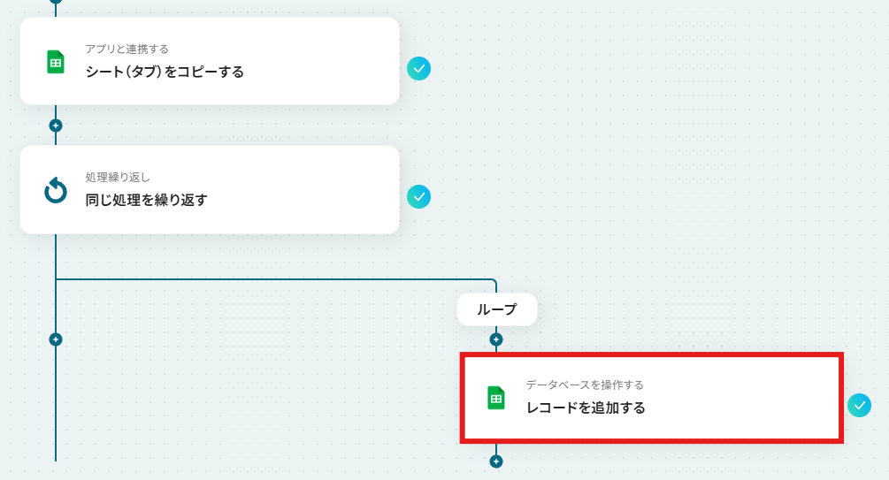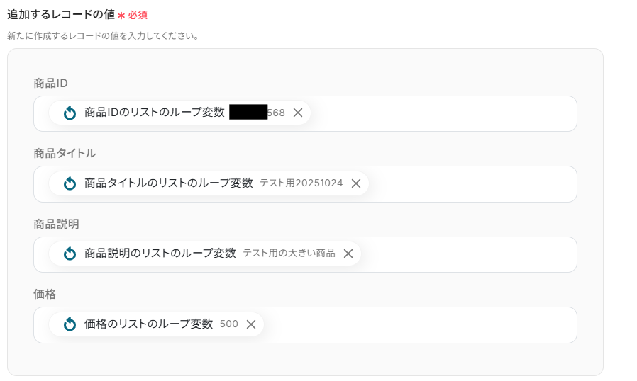 - 最後に、繰り返し処理の中でGoogle スプレッドシートの「レコードを追加する」アクションを設定し、手順4でコピーしたシートに商品情報を追加します。