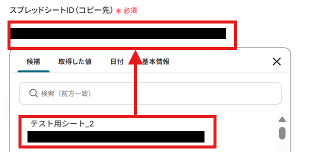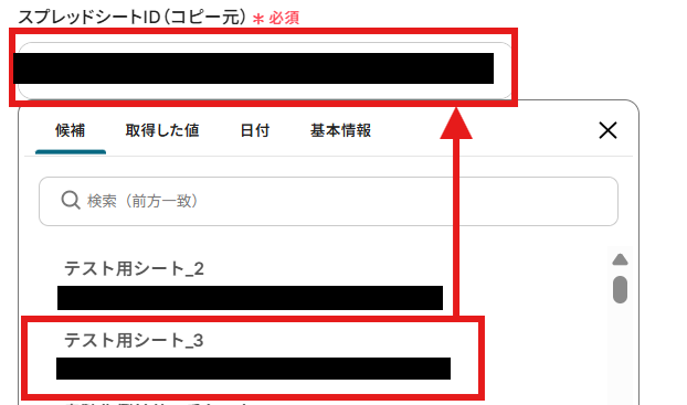 「スプレッドシートID(コピー先)」に上記シートを候補より指定します。