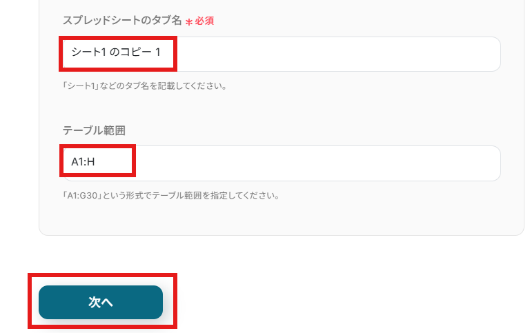 - Google スプレッドシートにレコードを追加する際に、データを書き込むスプレッドシート、シート、テーブルの範囲などを任意で設定してください。