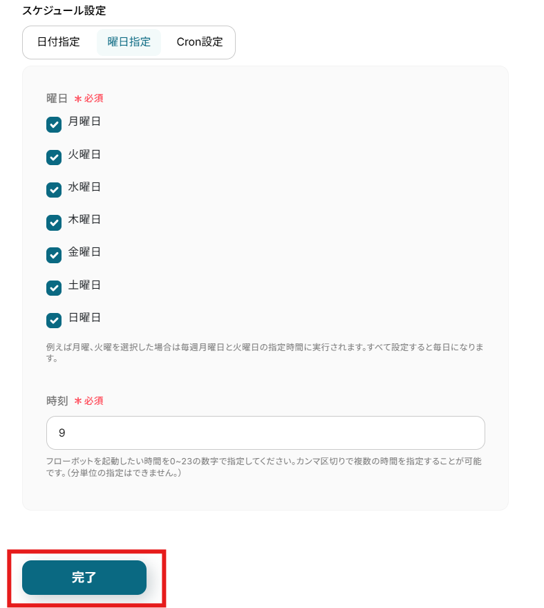 今回は以下のように、毎日午前9時に起動するように設定しました。