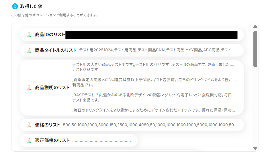 - 繰り返し機能を用いて、取得した商品を一つずつ処理し、各商品に対してBASEの「商品情報を取得」アクションで詳細な在庫情報を取得します。