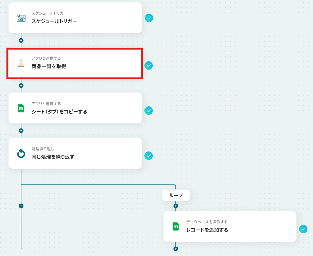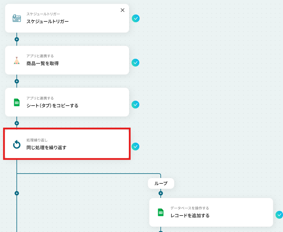 - 繰り返し処理機能を設定し、手順3で取得した商品一覧のデータを1件ずつ処理できるようにします。