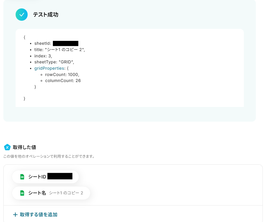ここまで設定をしたら、テストボタンをクリックします。テストが完了し、取得した値が入ればOKです。
