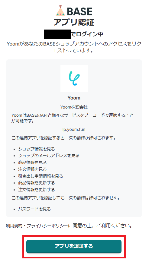連携確認ページが出るので、「アプリを認証する」をクリックしてください。