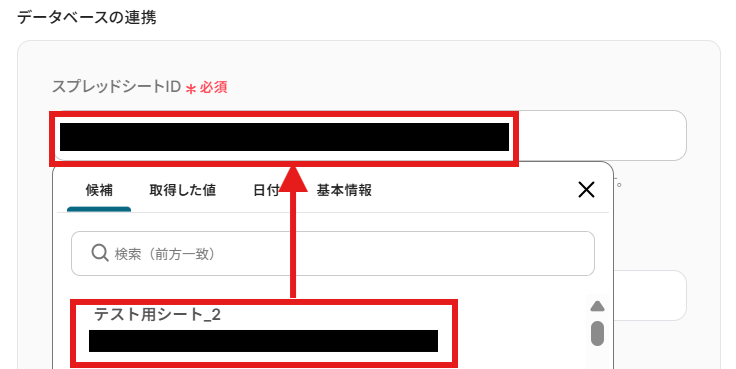 スプレッドシートID(コピー元)の部分は、候補から上記のシートを選択します。シートIDも候補から上記のシートIDを選択しておきましょう。