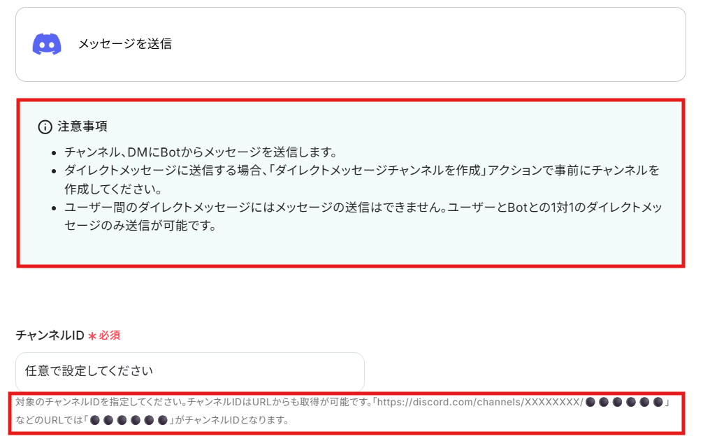 赤枠内の説明を参考にして、通知を送信するDiscordチャンネルのIDを設定してください。