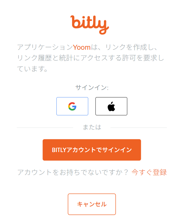 2.Bitlyのマイアプリ連携 Inoreader同様に、アプリ一覧でBitlyを検索し選択すると、以下の画面が表示されます。 Yoomと連携したいアカウントでログインしてください。