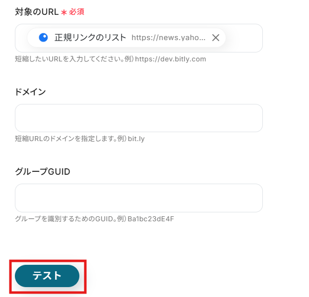 Google スプレッドシートのトリガー「行が追加されたら」では、フローを起動する間隔や対象のスプレッドシートID、シートID、テーブルの範囲、一意の値を格納する列などを任意で設定できます。 Bitlyの「リンクを短縮する」では、短縮したいURLの列を指定するほか、使用するドメインやグループGUIDも任意で指定することが可能です。 Google スプレッドシートの「レコードを更新する」では、対象のスプレッドシートIDやタブ名、テーブル範囲に加えて、更新したいレコードを特定するための条件や、更新後の値を任意に設定できます。 ■注意事項