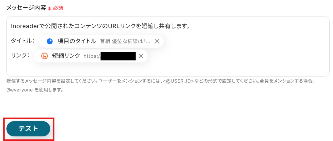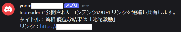 固定値部分 :「Inoreaderで公開されたコンテンツのURLリンクを短縮し共有します。」「タイトル:」「リンク:」