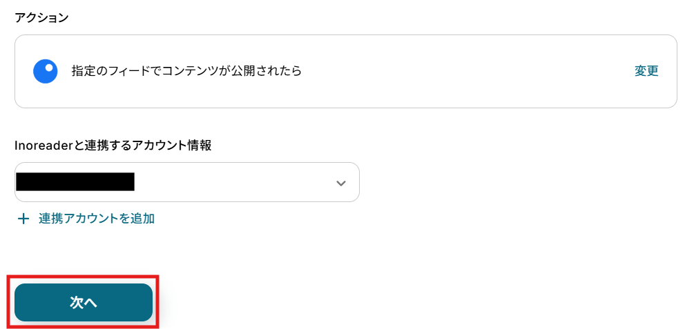 クリックすると以下の画面に移ります。 アカウント情報と書かれた項目にはステップ1でマイアプリ連携したアカウント情報が記載されています。 アクションは、「指定のフィードでコンテンツが公開されたら」のままで次に進みましょう!