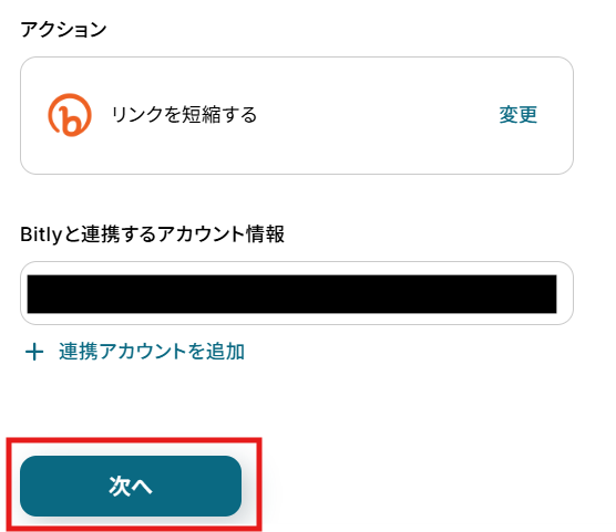 クリックすると以下の画面に移ります。 Inoreaderと同様に、ステップ1でマイアプリ連携したBitlyのアカウント情報が自動で表示されます。 アクションは、「リンクを短縮する」のままで次に進みましょう!