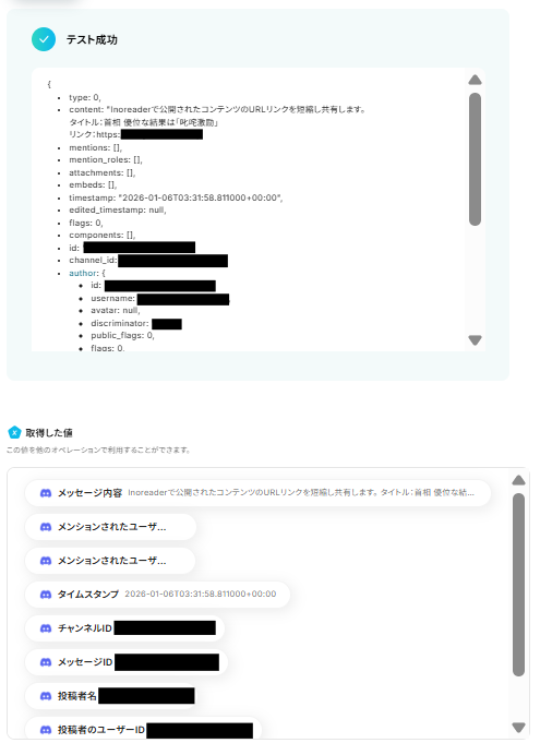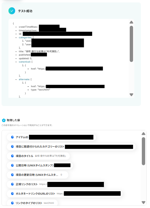 テストが成功すると取得した値の横に、連携したフィードから取得した記事の詳細情報が表示されます。 「完了」をクリックして設定完了です!