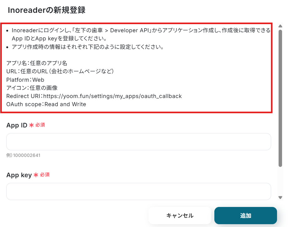 1.Inoreaderのマイアプリ連携 アプリ一覧で、Inoreaderを検索し選択すると、以下の画面が表示されます。 Inoreaderにログインし、赤枠内の説明を参考にして、アプリケーションを作成してください。
