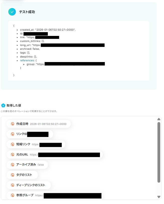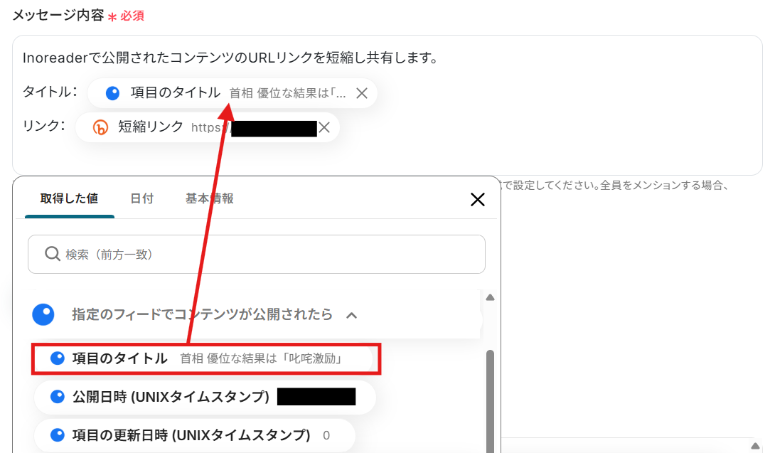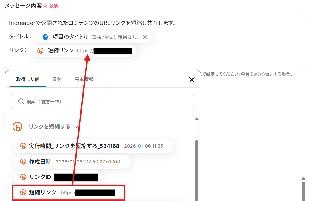 【Tips】 テキストを直接入力した部分は固定値として扱われます。 そのため、毎回変動が必要な情報(例:項目のタイトル・短縮リンクなど)は取得した値を活用しましょう! 例えば、下記のようにメッセージを編集することができます。