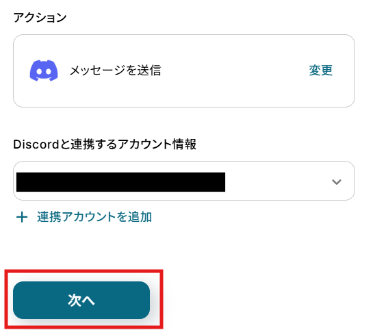 クリックすると以下の画面に移ります。 こちらもInoreaderと同様に、ステップ1でマイアプリ連携したDiscordのアカウント情報が自動で表示されます。 アクションは、「メッセージを送信」のままで次に進みましょう!