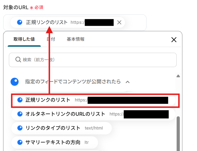 次に、短縮するURLを設定します。 編集欄をクリックして、「指定のフィードでコンテンツが公開されたら」から「正規リンクのリスト」を選択してください。※デフォルトで入力されている「←トリガーで取得した値を引用してください」は削除してくださいね!