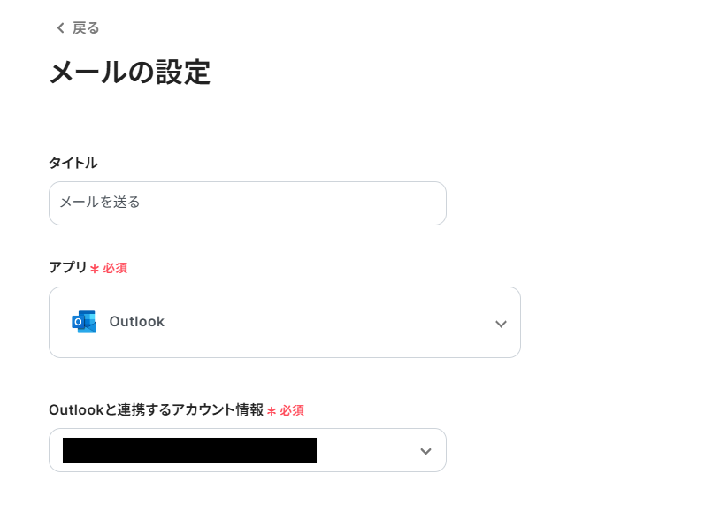 - Outlookと連携するアカウント情報:フローと紐づけるアカウントを選択してください。対象のアカウントがリストに表示されていないときは「アカウントを追加」から追加が可能です。