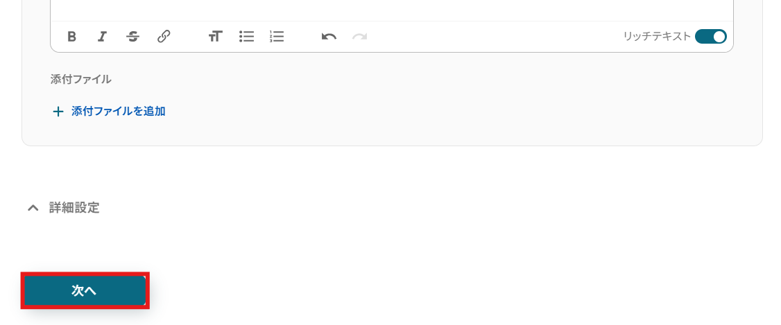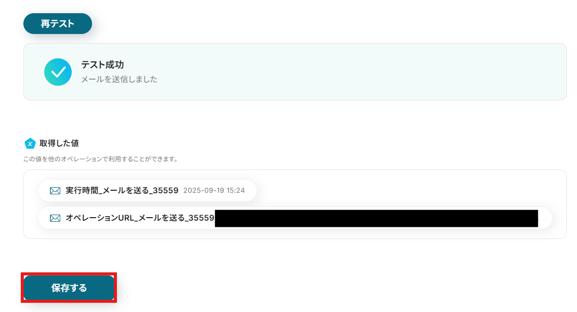 - 本文:送信するメールの本文を設定してください。こちらもプルダウンより1つ前のステップで取得した値を設定することができます。