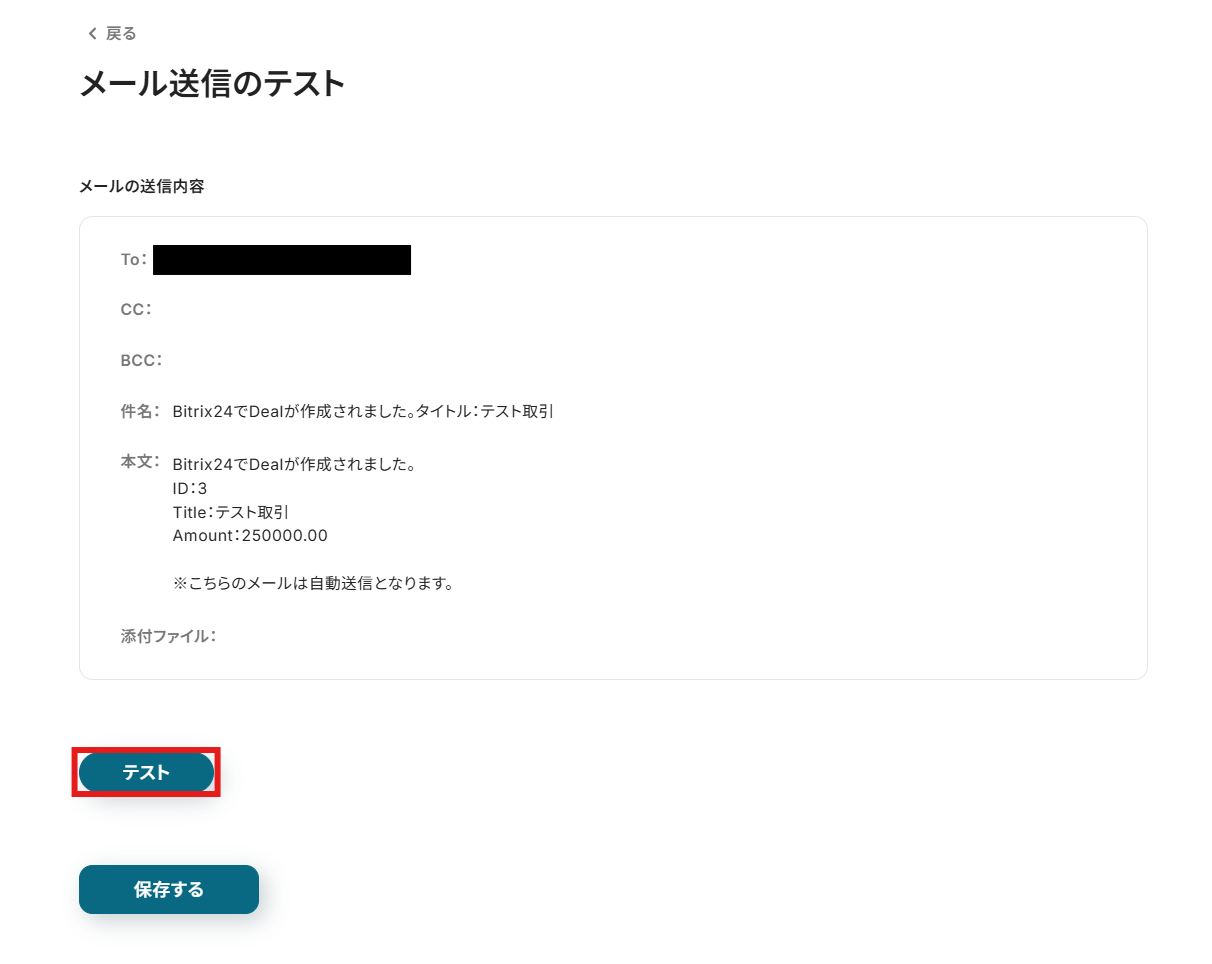 メール送信のテスト画面に表示される内容に問題がなければ、テストボタンをクリックしましょう。