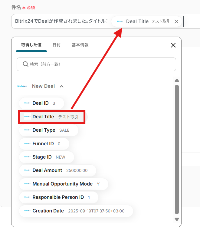 次の設定を行う前にBitrix24にて、Dealを作成しておきましょう。テスト用の情報なので、仮のもので問題ありません。