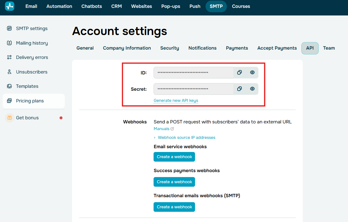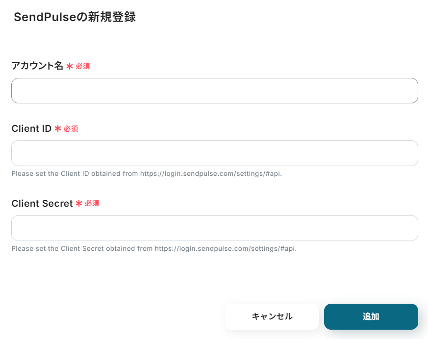 SendPulseよりAPIの情報を取得し入力してください。