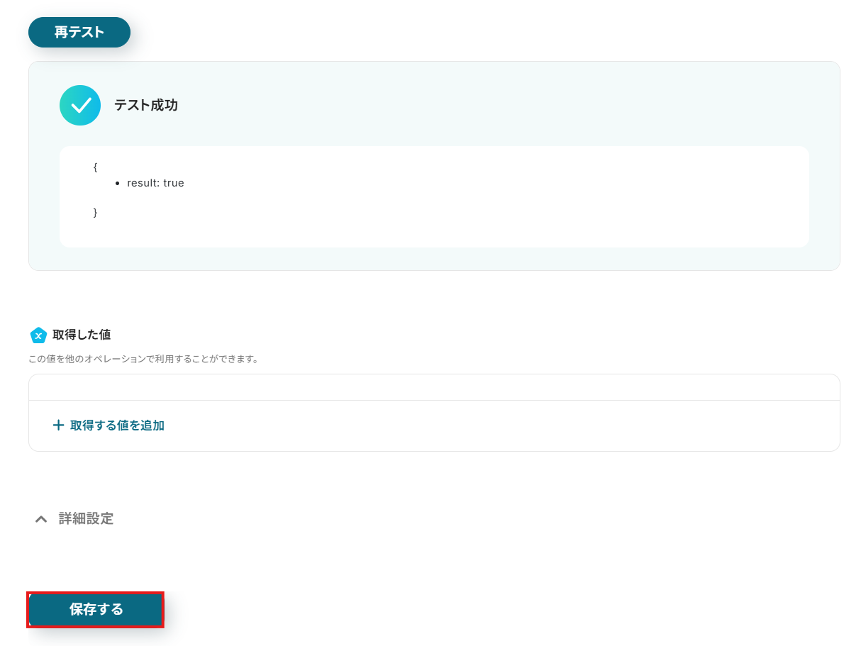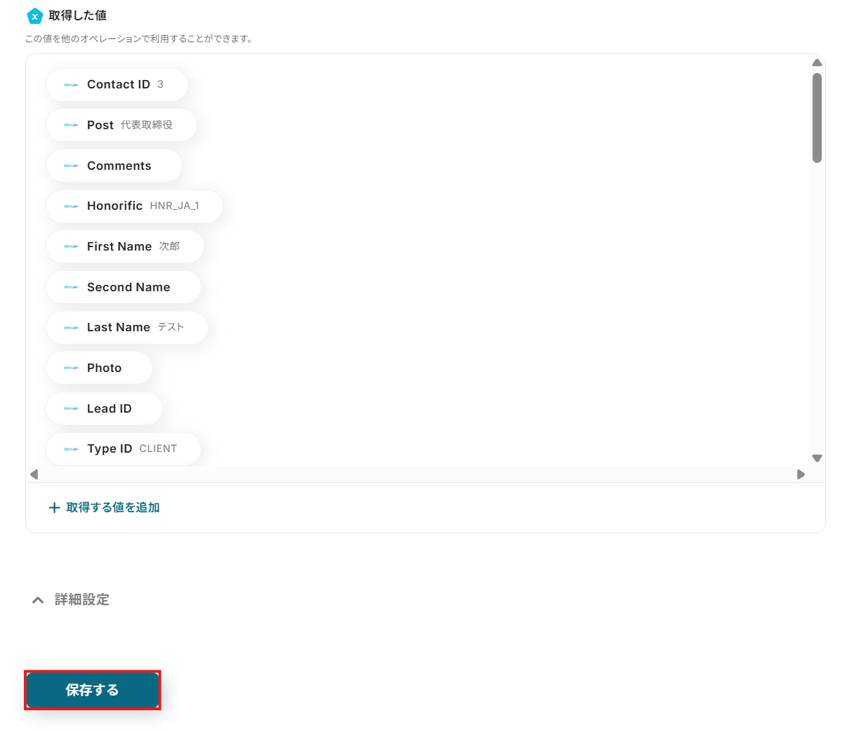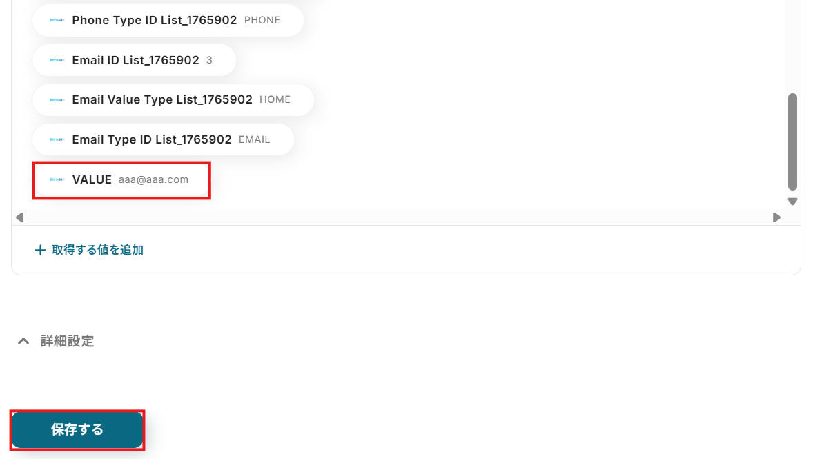 追加した値が取得した値の欄に反映されたことを確認して、保存するボタンをクリックしてください。