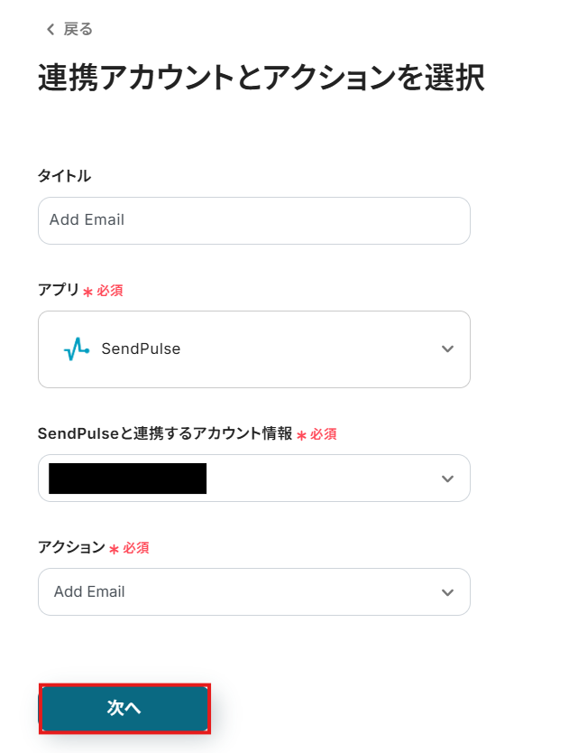 連携アカウントとアクションを選択画面では、 下記画像を参考に設定を行い次へボタンをクリックしましょう。